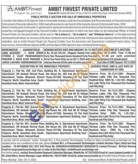 Property 3:- Flat No. 002, Ground Floor, Building No. A, Vajreshwari Apartment, Vajreshwari, Off Ambadi Shirsat Road, Old House No. 295 And 80 Of Village Vajreshwari, Taluka Bhiwandi, District Thane-421302. Boundary Of The Said Property: North: Gaonthan Area, South: Vajreshwari Apartment Building, East Gaonthan Area, West: Internal Road