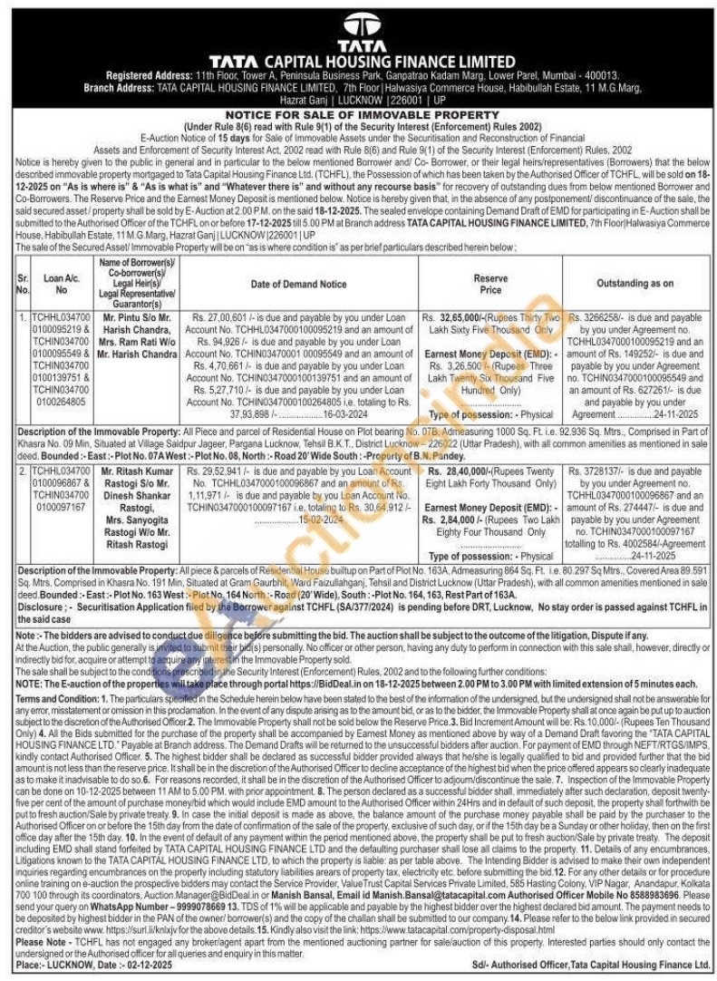Description of the Immovable Property: All Piece and parcel of Residential House on Plot bearing No. 07B, Admeasuring 1000 Sq. Ft. i.e. 92.936 Sq. Mtrs, Comprised in Part of Khasra No. 09 Min, Situated at Village Saidpur Jageer, Pargana Lucknow, Tehsil B.K.T.. District Lucknow-226022 (Uttar Pradesh), with all common amenities as mentioned in sale deed. Bounded:-East:-Plot No. 07A West:-Plot No. 08, North:-Road 20 Wide South:-Property of B.N. Pandey.