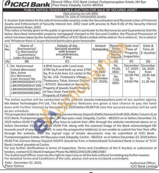 4 BHK house with Land area 4790 Sq.ft and built-up area 2700 Sq. ft in 4.44 Ares (11 cents) in Re Sy No. 216, Thalassery Village, / Thalassery Taluk, Kannur District Property of Jaseela South: Property of Saru East: Foot Path. West: Property of Fathima