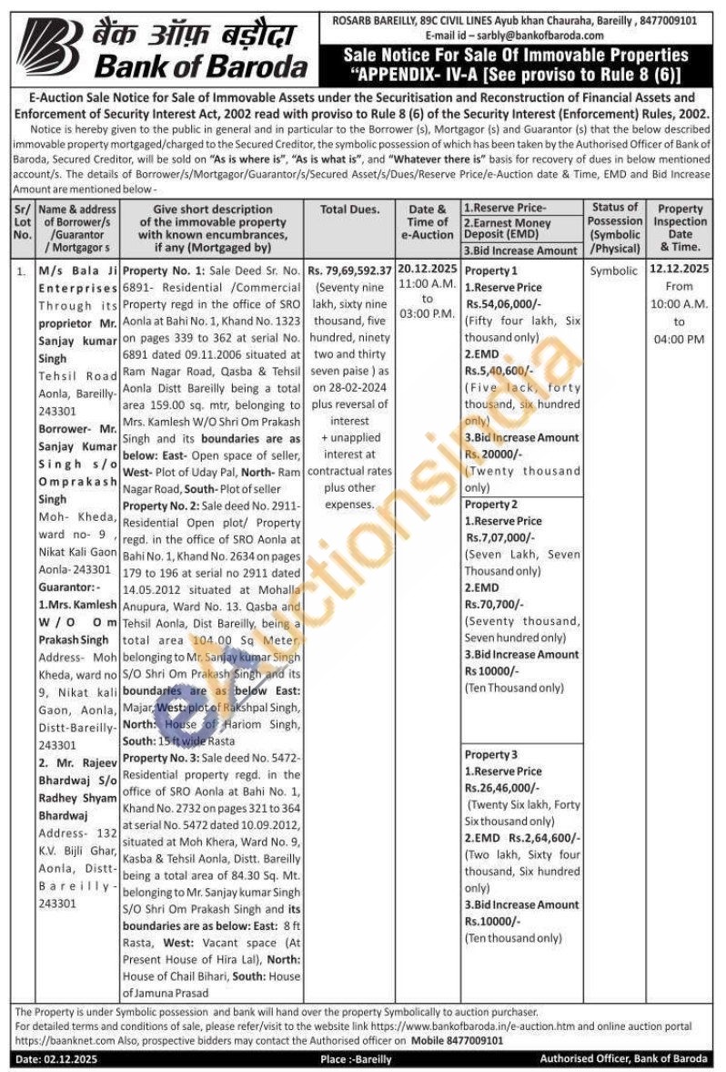 Property No. 1: Sale Deed Sr. No. 6891- Residential /Commercial Property regd in the office of SRO Aonla at Bahi No. 1, Khand No. 1323 on pages 339 to 362 at serial No. 6891 dated 09.11.2006 situated at Ram Nagar Road, Qasba & Tehsil Aonla Distt Bareilly being a total area 159.00 sq. mtr, belonging to Mrs. Kamlesh W/O Shri Om Prakash Singh and its boundaries are as below: East- Open space of seller, West-Plot of Uday Pal, North- Ram Nagar Road, South-Plot of seller