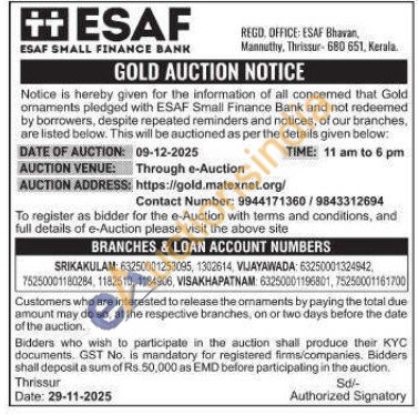 ESAF SMALL FINANCE BANK Gold Auctions Auction in Thrissur
