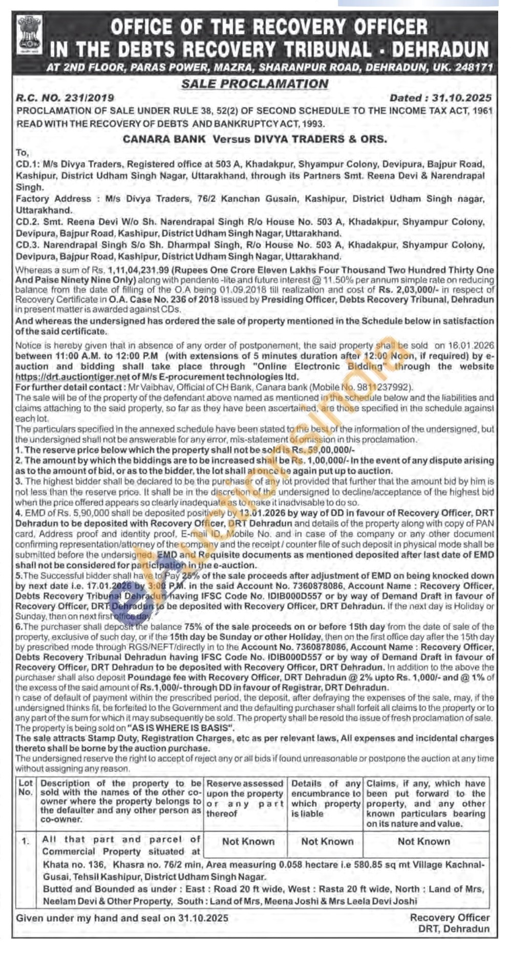 All that part and parcel of Commercial Property situated at Khata no. 136, Khasra no. 76/2 min, Area measuring 0.058 hectare i.e 580.85 sq mt. Village Kachnal-Gusai, Tehsil Kashipur, District Udham Singh Nagar. Butted and Bounded as under: East: Road 20 ft wide, West: Rasta 20 ft wide, North: Land of Mrs. Neelam Devi & Other Property, South: Land of Mrs, Meena Joshi & Mrs Leela Devi Joshi