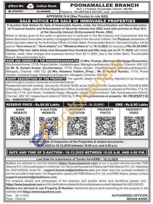 Residential land with building: Survey No.76/2A & 76/28, as per Patta No. 1530, Subdivided No. 76/2AIB & 2BIB of Mangadu Village, within the Sub Registration Office, Kundrathur. The property is situated at Plot Nos. 17 & 18, Door No. 17/18, 2nd Street, Visalakshi Nagar, Mangadu Village, Sriperumbudur Talk, Kancheepuram District, Chennai-600 122 measuring an extent of 1602 Sq. ft. Prior Encumbrances on property: Nil. PROPERTY ID No.: IDIB6597897357