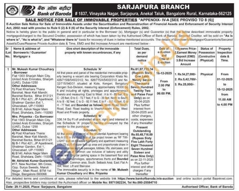 Schedule 'A' All that piece and parcel of the residential immovable prop-erty bearing a vacant site bearing Corporation Khata No. 426/715/8/540/2/31/2, No. 826/715/4/540/2/31/2 and No. 32/715/540/31 situated at Kole, Kengeri, Bengaluru Kengeri Sub-Division, measuring approximately 16300 Sq and including all rights, privileges and appurtenances thereto and measuring: East to West: A to H-88 feel, 8 to C-25 feet D to E-727 feet, F to G-39 feet, North to South A to B-92 feet. C to D-92.11 feet, E to F-110.10 feet, G to H-77 feet and Bounded as follows: North Road, South Road, East: Road leading to Vrushbhavathi River. West Road and Private property..Schedule 'B' 336.14 Sq Ft of undivided share, right and interest in the Schedule 'A' property hereby conveyed by the vendor to the purchaser Schedule 'C' All that piece and parcel of the residensial Apartment bearing No A-305 in the third floor of the project known as RF TW-LIGHT built on schedule A property and apartment measuring 1154.73 sq ft of super built up area and proportionate share in common areas such as passages, lobbies lifts, staircases, and ather areas of common use inclusive of balcony and utility areas with One car parking space in the basement floor and includes right privileges, appurtenances tharto and Bounded on: North Common area, South Setback Arsa East. Flat A-304, West Lift and Staircase