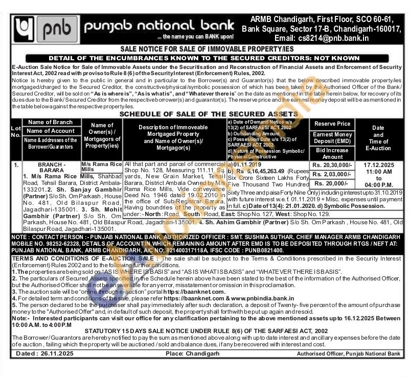 All that part and parcel of commercial Shop No. 128, Measuring 111.11 Sq. yards, New Grain Market Tehsil Barara, District Ambala Owned by M/s Rama Rice Mills, Vide conveyance Deed No. 1946 dated 19.02.2010 in the office of Sub-Registrar Barara Having boundries of the property as under:-North: Road, South: Road, Shop No. 127, West: Shop No. 129