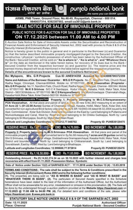 Property 2: Property belonging to Mr.S.Srinivasa- POA Viswanathan. All that piece and parcel of the immovable property being industrial converted land in Sy No.68 measuring 1 acres and 29 guntas owned by Shri S Srinivasa, situated at Kodur village, Doddashivara Gramapanchayat, Kasaba Hobli, Malur Taluk, Kolar District and bounded on the North by Land belonging to Chikkaramaiah, South by: Land belonging to Soorabbaiah, East by: Road, West by: Land belonging to Bhadrappa