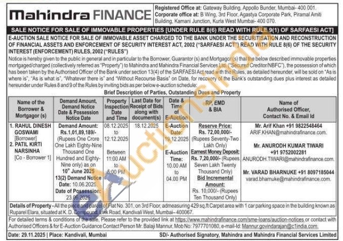 Details of Property-All the piece and parcel of Flat No. 301, on 3rd Floor, admeasuring 429 sq.ft Carpet area with 1 car parking space in the building known as Ruparel Elara, situated at K. D. Compound. Link Road, Kandivali West, Mumbai-400067.