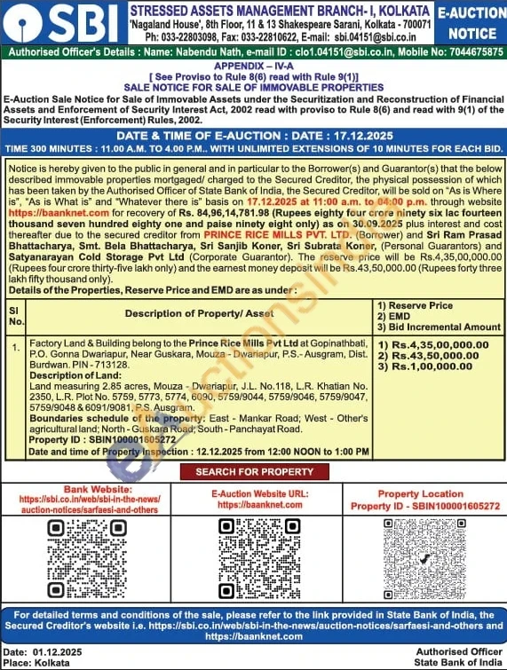 Factory Land & Building belong to the Prince Rice Mills Pvt Ltd at Gopinathbati, P.O. Gonna Dwariapur, Near Guskara, Mouza - Dwariapur, P.S.-Ausgram, Dist. Burdwan. PIN-713128