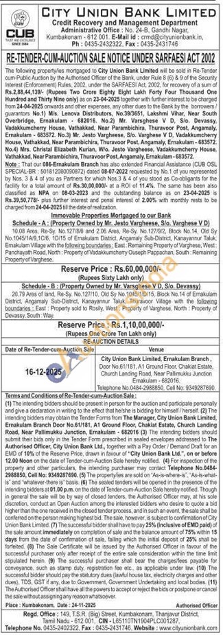 Immovable Properties Mortgaged to our Bank : Schedule-B: (Property Owned by Mr. Varsghese V D, S/o. Devassy): 20.79 Ares of land, Re-Sy. No. 127/10, Old Sy No.1045/1/D/15, Block No. 14 of Ernakulam District, Angamaly Sub-District, Kanayannur Taluk, Thuravoor Vilage with the following boundaries: East: Property sold to Rosily, West: Property of Varghese, North: Property of Devassy, South Way