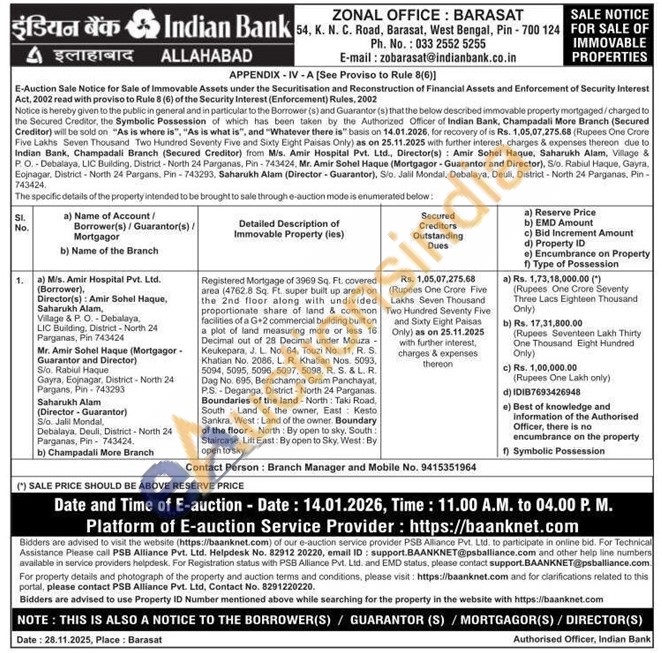 Registered Mortgage of 3969 Sq. Ft. covered area (4762.8 Sq. Ft. super built up area) on the 2nd floor along with undivided proportionate share of land & common facilities of a G+2 commercial building built on a plot of land measuring more or less 16 Decimal out of 28 Decimal under Mouza Keukepara, J. L. No. 64, Touzi No. 11, R. S Khatian No. 2086, L. R. Khatian Nos. 5093, 5094, 5095, 5096, 5097, 5098, R. S. & L. R. Dag No. 695, Berachampa Gram Panchayat, P.S.-Degangia. District-North 24 Parganas. Boundaries of the land-North: Taki Road, South Land of the owner, East Kesto Sankra, West: Land of the owner. Boundary of the floor North By open to sky, South: Staircase, Lift East: By open to Sky, West: By open to sky