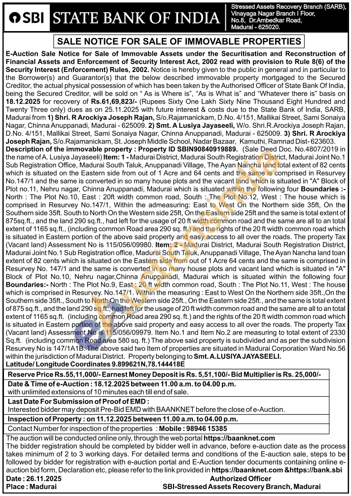 Description of the immovable property: Property ID SBIN90840919889. (Sale Deed Doc. No.4807/2019 in the name of A. Lusiya Jayaseeli) Item: 1-Madurai District, Madurai South Registration District, Madurai Joint No. 1 Sub Registration Office, Madurai South Taluk, Anuppanadi Village, The Ayan Nancha land total extent of 82 cents which is situated on the Eastern side from out of 1 Acre and 64 cents and the same is comprised in Resurvey No.147/1 and the same is converted in so many house plots and the vacant land which is situated in "A" Block of Plot no. 11, Nehru nagar, Chinna Anuppanadi, Madurai which is situated within the following four Boundaries :-North: The Plot No.10, East: 20ft width common road, South: The Plot No.12, West: The house which is comprised in Resurvey No.147/1, Within the admeasuring: East to West On the Northern side 35ft, On the Southern side 35ft. South to North On the Western side 25ft, On the Eastern side 25ft and the same is total extent of 875sq.ft., and the land 290 sq.ft., had left for the usage of 20 ft width common road and the same are all to an total extent of 1165 sq.ft., (including common Road area 290 sq. ft.) and the rights of the 20 ft width common road which is situated in Eastern portion of the above said property and easy access to all over the roads. The property Tax (Vacant land) Assessment No is 115/056/09980. Item: 2 - Madurai District, Madurai South Registration District, Madurai Joint No. 1 Sub Registration office, Madurai South Taluk, Anuppanadi Village, The Ayan Nancha land toan extent of 82 cents which is situated on the Eastern side from out of 1 Acre 64 cents and the same is comprised in Resurvey No. 147/1 and the same is converted in so many house plots and vacant land which is situated in "A" Block of Plot No.10, Nehru nagar, Chinna Anuppanadi, Madurai which is situated within the following four Boundaries:- North: The Plot No.9, East: 20 ft width common road, South: The Plot No.11, West: The house which is comprised in Resurvey. No. 147/1. Within the measuring: East to West On the Northern side 35ft., On the Southern side 35ft., South to North On the Western side 25ft., On the Eastern side 25ft., and the same is total extent of 875 sq.ft., and the land 290 sq.ft., had left for the usage of 20 ft width common road and the same are all to an total extent of 1165 sq.ft. (including common Road area 290 sq. ft.) and the rights of the 20 ft width common road which is situated in Eastern portion of the above said property and easy access to all over the roads. The property Tax (Vacant land) Assessment No is 115/056/09979. Item No.1 and Item No.2 are measuring to total extent of 2330 Sq.ft. (including common Road area 580 sq. ft.) The above said property is subdivided and as per the subdivision Resurvey No is 147/1A1B. The above said two Item of properties are situated in Madurai Corporation Ward No.56 within the jurisdiction of Madurai District. Property belonging to Smt. A.LUSIYA JAYASEELI.