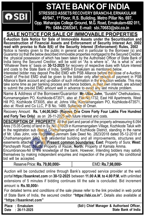 DESCRIPTION OF PROPERTY: All that part and parcel of the property admeasuring 6.094 Ares (15.05 Cents) of land in Sy. No. 310/29 in Kunnamangalam Village, Kozhikode Taluk with in the registration sub district Chathamangalam of Kozhikode District, standing in the name of Mr. Ullas John, vide Registered Jenmam Sale Deed No. 2823/2018 dated 05-12-2018 of Chathamangalam SRO with residential building and all improvements, structures and easements attached thereto. Present common boundaries: East: Property of Sura; West: Panchayath Road; South: Property of Razak; North: Property of Kamala Amma. Encumbrances-Nil to the knowledge of the bank. However, Intending bidders may satisfy themselves by making independent enquiries and inspection of the property. No conditional bid will be accepted.