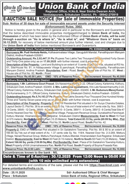 Description of the Property: Property-1: EMD of Residential Plot situated in Sri Surya Chandra Estates. Layout Sector D. Plot No. 36 to an extent of 83.33 Sq. Yds out of total extent of 47 cents vide Sy. Nos. 388/3-15 Cents, 389/8-12 Cents, 389/9-4 Cents, 389/10-5 Cents, 389/11-5 Cents, 389/12-6 Cents(Total Site 47 Cents) Nearest Door No. 1-4-236, Gunabadhra Village, Parapuram Revenue Group, Gunabadhra Panchayat, Kotturu Mandal, Hiramandalam Sub Registrar, Srikakulam District Measurements: East to West:15 Feet (4.575 meters), North to South:50 Feet (15.25 Meters). Total Extent:83.33 Sq. yards (69.99 Sq. Mts)., Plot Bonded By: East: Plot No. 37, West: Plot No.35, North: Layout Road, South: Plot No. 42