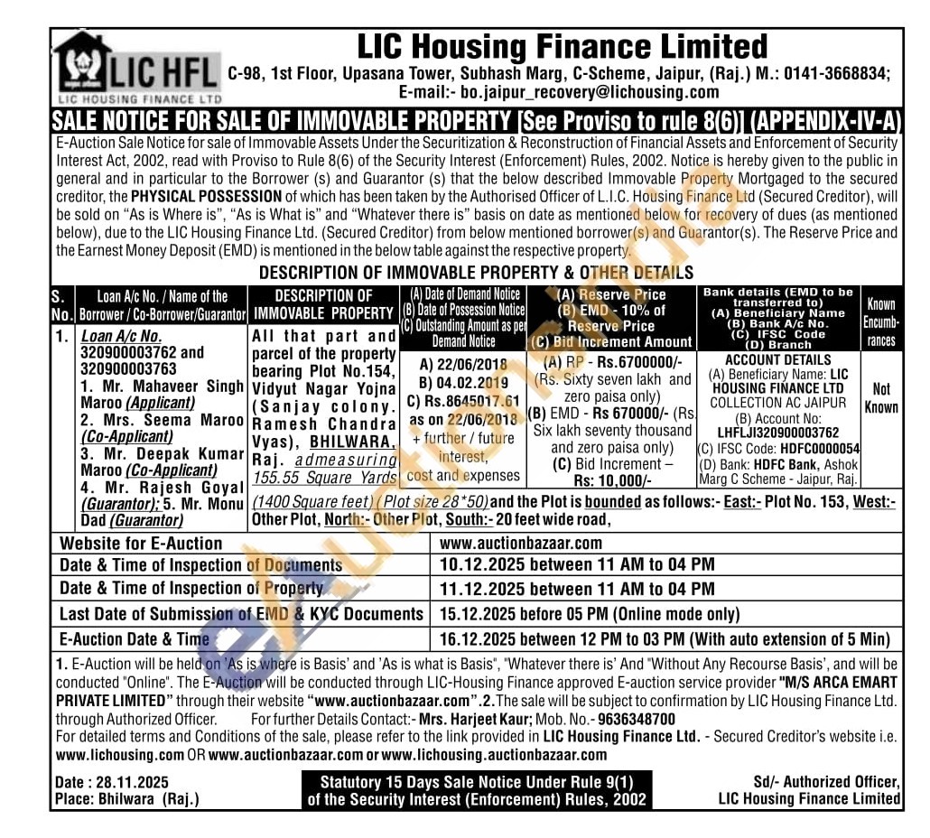 All that part and parcel of the property bearing Plot No.154, Vidyut Nagar Yojna (Sanjay colony. Ramesh Chandra Vyas), BHILWARA,RAJ admeasuring 155.55 Square Yards (1400 Square feet) (Plot size 28*50) and the Plot is bounded as follows:- East:- Plot No. 153, West:-Other Plot, North:- Other Plot, South:-20 feet wide road,