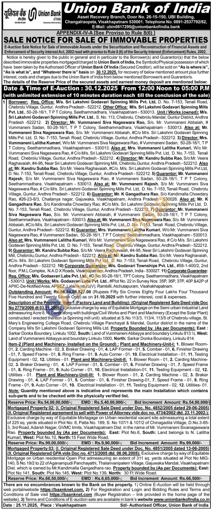 Description of the Property: Item-1 (Factory Land and Building): (Original Registered Sale Deed vide Doc No 2779/2006 dt 03.11.2006): Exclusive charge by way of Equitable Mortgage on the Semi urban Industrial Land admeasuring Acre 8.15 Cents along with buildings/Civil Works and Plant and Machinery (Except the Solar Plant) constructed/erected thereon (a Spinning mill unit) situated at S.No 113/3, 113/4, 113/5 of Chebrolu village, St. Mary's Engineering College Road, Chebrolu Village Panchayat & Mandal, Guntur district in the name of the Company M/s Sri Lakshmi Godavari Spinning Mills Ltd. Property Bounded by (As per Documents): East: Sarkar Donka Boundary, Linkulu 1002, South: Land of Vummaneni Abbayya and boundary Linkulu 813%, West: Land of Vummaneni Abbayya and boundary Linkulu 1000, North: Sarkar Donka Boundary, Linkulu 814. Item-2 (Plant and Machinery- Installed on the Ground): Plant and Machinery-Unit-1: 1. Blower Room-01, 2. Carding Machine-02, 3. Braker Drawing-01, 4. LAP Former-01, 5. Comber-01, 6. Finisher Drawing -01, 7. Speed Frame-01, 8. Ring Frame-01, 9. Auto Corner-01, 10. Electrical Installation-01, 11. Testing Equipment-02, 12. Utilities-01. Plant and Machinery-Unit-II: 1. Blower Room-01, 2. Carding Machine-02, 3. Braker Drawing-01, 4. LAP Former-01, 5. Comber-01, 6. Finisher Drawing-01, 7. Speed Frame -01, 8. Ring Frame-01, 9. Auto Corner-01, 10. Electrical Installation-01, 11. Testing Equipment-02, 12. Utilities 01. Plant and Machinery-Unit-III: 1. Blower Room 01. 2. Carding Machine 02, 3. Braker Drawing-01, 4. LAP Former-01, 5. Comber 01, 6. Finisher Drawing-01, 7. Speed Frame-01, 8. Ring Frame-01, 9. Auto Comer-01, 10. Electrical Installation-01, 11. Testing Equipment-02, 12. Utilities-01. Note: Quantity mentioned above is indicative and represents the main Installation which contains sub-parts and to be checked with the physically verified list.