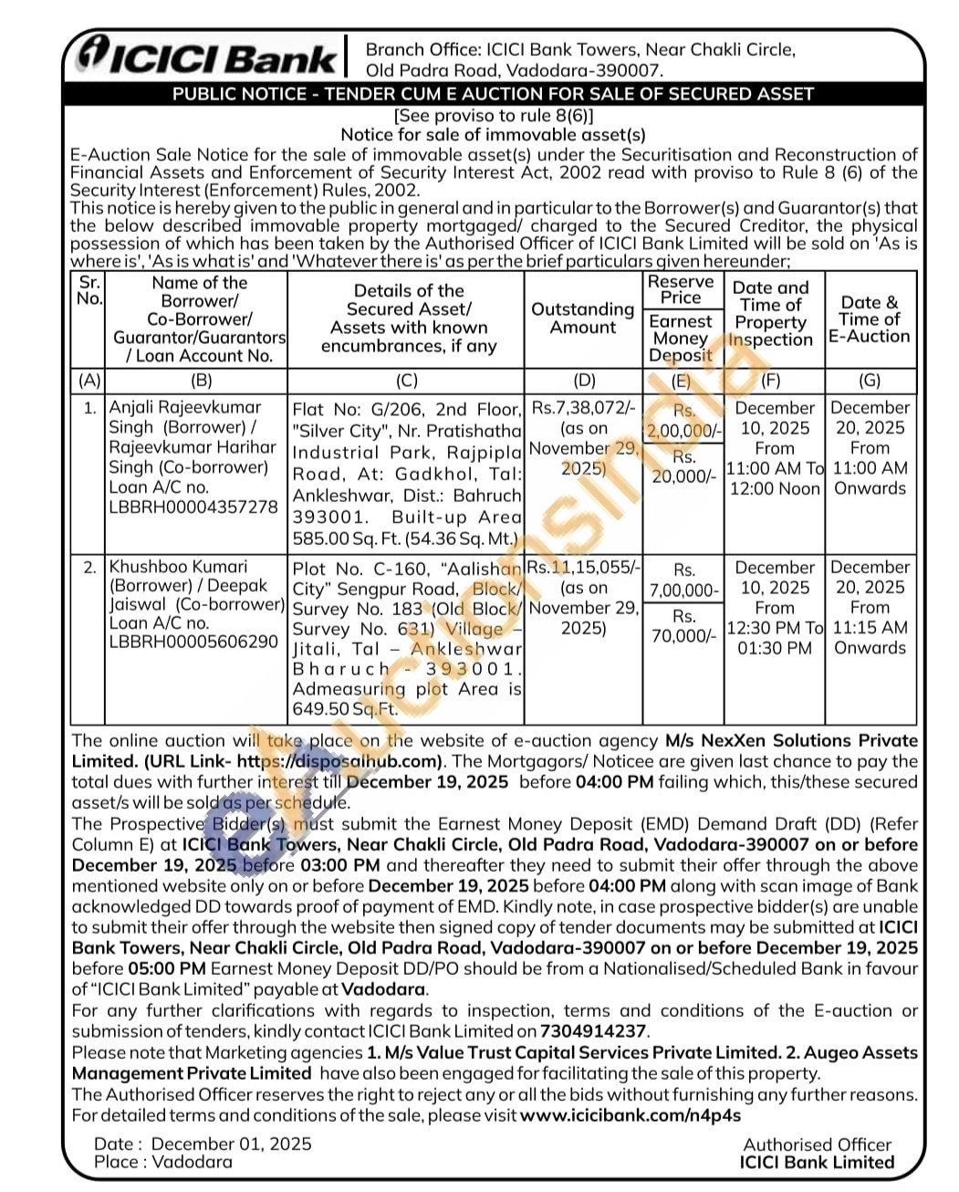 Plot No. C-160, "Aalishan City" Sengpur Road, Block/Survey No. 183 (Old Block/Survey No. 631) Village Jitali, Tal Ankleshwar Bharuch 393001. Admeasuring plot Area is 649.50 Sq.Ft.