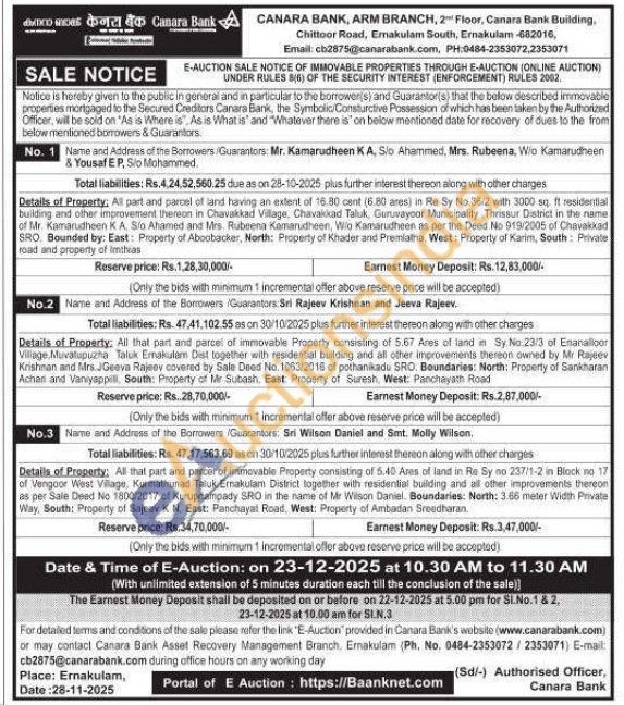 Details of Property: All part and parcel off land having an extent of 16.80 cent (6.80 ares) in Re Sy No.36/2 with 3000 sq. ft residential building and other improvement thereon in Chavakkad Village, Chavalkad Taluk, Guruvayoor Municipality Thrissur District in the name of Mr. Kamarudheen K. A, Sio Ahamed and Mrs. Rubeena Kamarudheen, Wo Kamarudheen as per the Deed No 919/2005 of Chavakkad SRO Bounded by: East: Property of Aboobacker, North: Property of Khader and Premlatha, West: Property of Karim, South: Private road and property of imthias