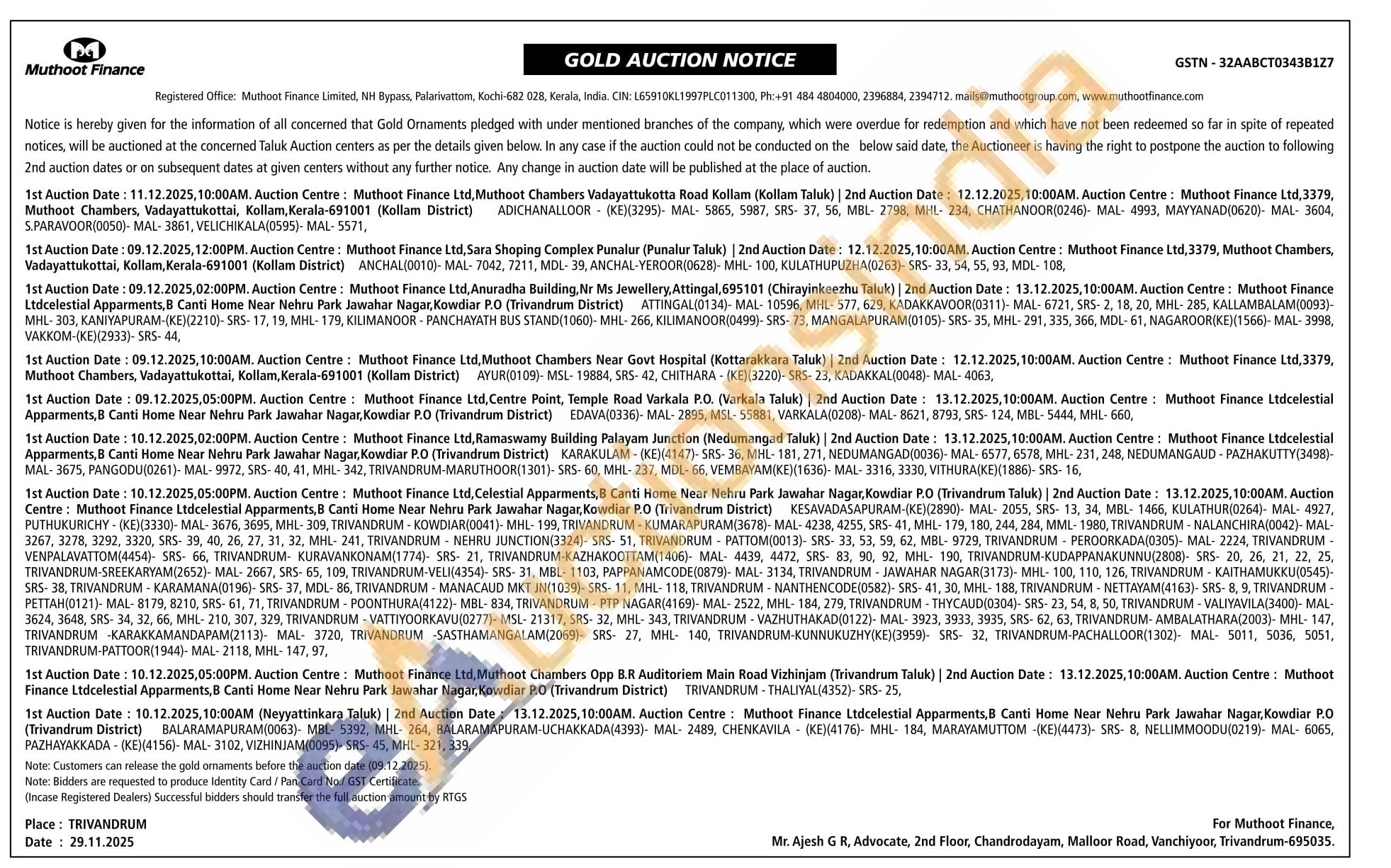 Muthoot Finance Ltd Gold Auctions Auction in Trivandrum