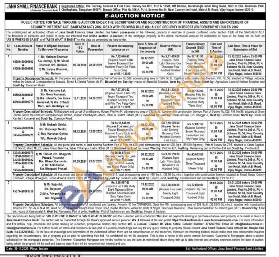 Property Description/ Schedule: All that piece and parcel of land bearing House/ Plot No.44, admeasuring area of 792 Sq ft, together with construction thereon, Part of Survey No. 726, PH. No.96, situated at Gram Umran, within the limits of Grampanchayat Umran, Janpad Panchayat Ratlam, Tehsil & District Ratlam (MP). Bounded by: East by: House of Raju, Sio. Bhagga J, West by: Common Road, North by: House of Kamlesh Kumawat and South by: Common Road