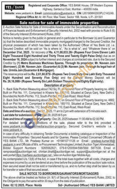 Description of property : 1-Back Side Portion Measuring about 742 Sq. Ft, on Ground Floor of Property bearing no. 4882. Built on Plot No. 111, Comprised in Khasra No. 180/110, Situated at Darya Ganj, New Delhi-2 Bounded As North-Plot No. 112. South-Plot No. 110, East-Road, West-Road
