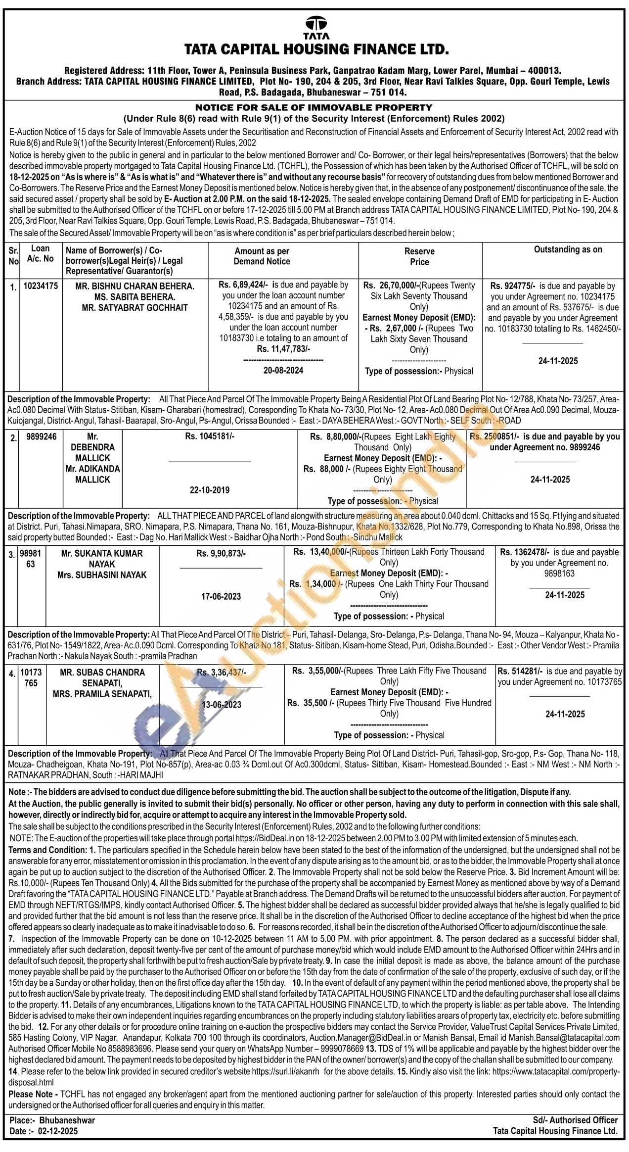 Description of the Immovable Property: All That Piece And Parcel Of The Immovable Property Being Plot Of Land District-Puri, Tahasil-gop, Sro-gop, P.s- Gop, Thana No- 118, Mouza- Chadheigoan, Khata No-191, Plot No-857(p), Area-ac 0.03% Dcml.out Of Ac0.300dcml, Status- Sittiban, Kisam- Homestead. Bounded:- East:- NM West :- NM North :-RATNAKAR PRADHAN, South: -HARI MAJHI