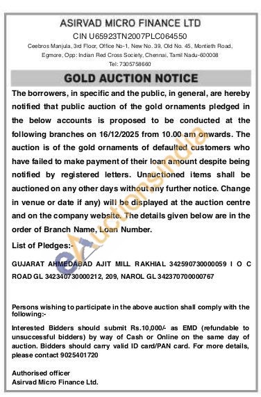 Asirvad Micro Finance Ltd Gold Auctions Auction in Ahmedabad