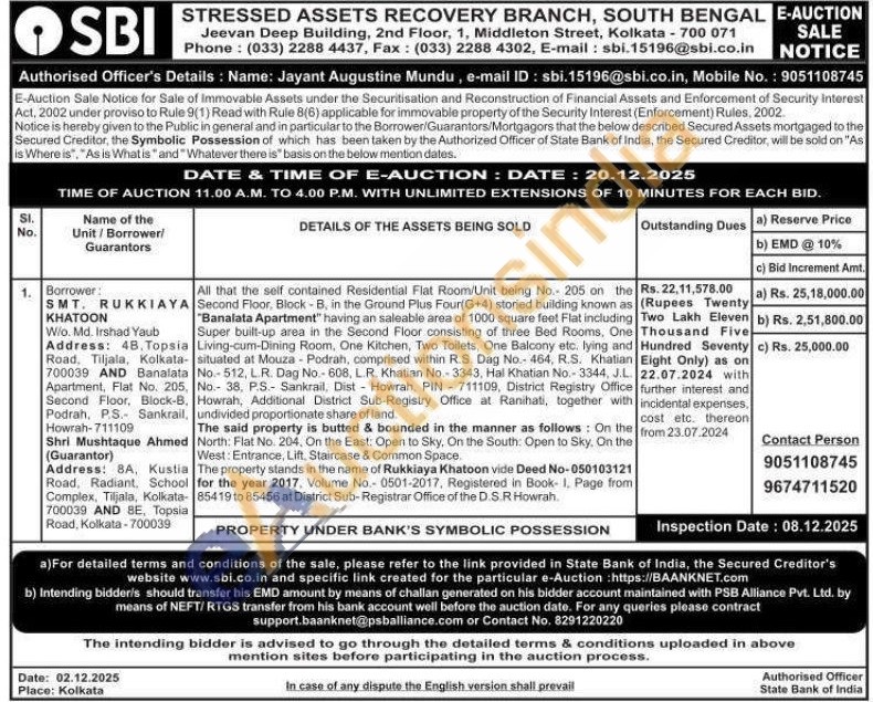 All that the self contained Residential Flat Room/Unit being No.- 205 on the Second Floor, Block B, in the Ground Plus Four(G+4) storied building known as "Banalata Apartment" having an saleable area of 1000 square feet Flat including Super built-up area in the Second Floor consisting of three Bed Rooms, One Living-cum-Dining Room, One Kitchen, Two Toilets, One Balcony etc. lying and situated at Mouza - Podrah, comprised within R.S. Dag No.- 464, R.S. Khatian No.-512, L.R. Dag No.-608, L.R. Khatian No.-3343, Hal Khatian No.-3344, J.L. No. 38, P.S. Sankrail, Dist Howrah, PIN711109, District Registry Office Howrah, Additional District Sub-Registry Office at Ranihati, together with undivided proportionate share of land.The said property is butted & bounded in the manner as follows: On the North: Flat No. 204, On the East: Open to Sky, On the South: Open to Sky. On the West: Entrance, Lift, Staircase & Common Space.The property stands in the name of Rukkiaya Khatoon vide Deed No-050103121 for the year 2017, Volume No. 0501-2017, Registered in Book I, Page from 85419 to 85456 at District Sub-Registrar Office of the D.S.R Howrah.