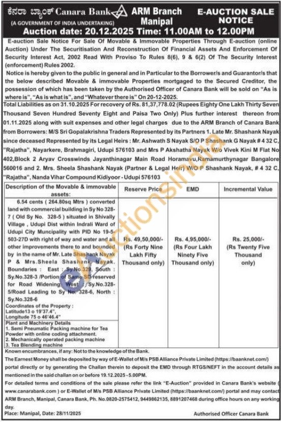 Description of the Movable & immovable assets : 6.54 cents (264.80sq Mtrs) converted land with commercial building in Sy No 328-7 (Old Sy No. 328-5) situated in Shivally Village, Udupi Dist within Indrali Ward of Udupi City Muncipality with PID No 19-5-503-270 with right of way and water and all other improvements there to and bounded by in the name of Mr. Late Shashank Nayak P & Mrs.Sheela Shashank Nayak. Boundaries: East Sy.No.329, South: Sy.No.328-3/Portion of Same SD reserved for Road Widening, West Sy.No.328-5/Road Leading to Sy No. 328-6, North: Sy.No.328-6