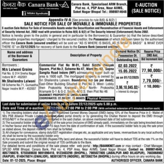 Commercial Flat No M-01. Sahil Siddhi Vinayak Square, Plot No 2, Scheme No 47, Ward No. 63, Sapna Sangita Road Indore (MP) admeasuring super built up area is 1600 sqft. The mortgaged property is owned by Sri Shailendra Lalwani. Boundaries are (as per deed): East-Other Building Situated at Plot No 3. West- Lobby then Prakoshta Kramank M-2. North Prokoshta Kramank G-1 & G-2, South -M.O.S. then Plot No 46