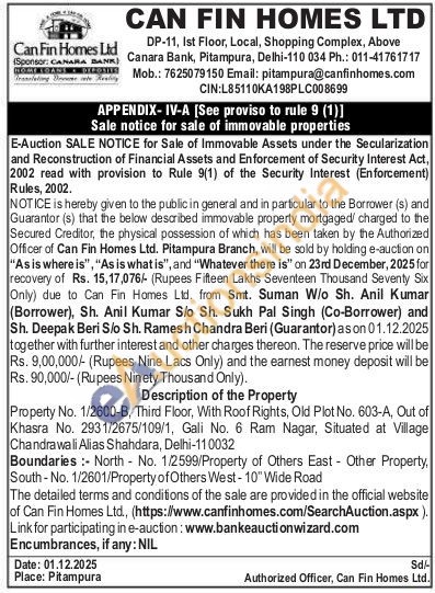 Description of the Property : Property No. 1/2600-B, Third Floor, With Roof Rights, Old Plot No. 603-A, Out of Khasra No. 2931/2675/109/1, Gali No. 6 Ram Nagar, Situated at Village Chandrawali Alias Shahdara, Delhi-110032