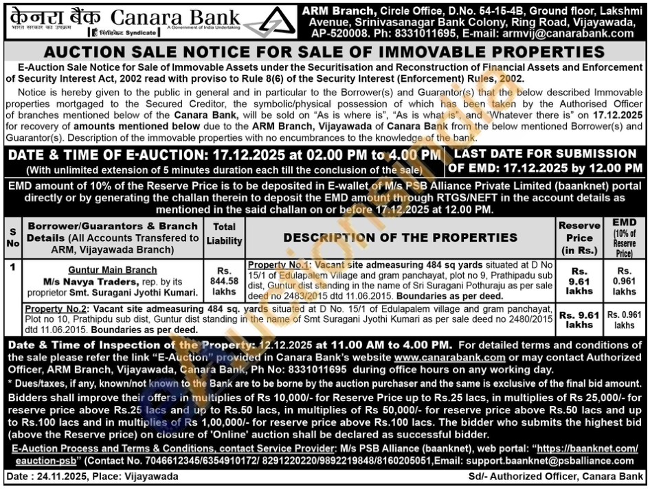 Property No.2: Vacant site admeasuring 484 sq. yards situated at D No. 15/1 of Edulapalem village and gram panchayat, Plot no 10, Prathipdu sub dist, Guntur dist standing in the name of Smt Suragani Jyothi Kumari as per sale deed no 2480/2015 dtd 11.06.2015. Boundaries as per deed