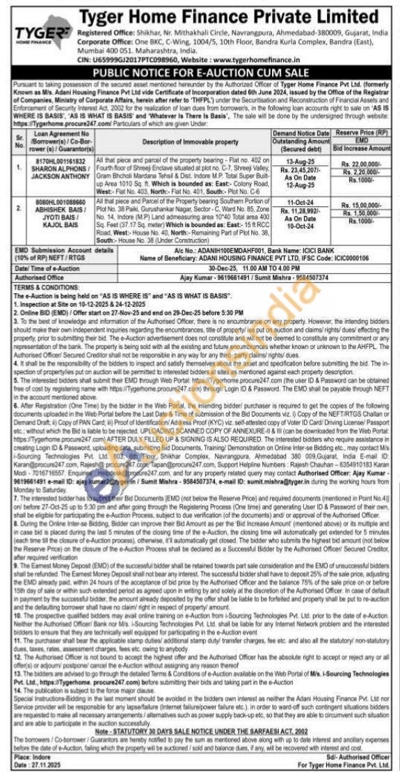 All that piece and parcel of the property bearing - Flat no. 402 on Fourth floor of Shreeji Endave situated at plot no. C-7, Shreej Valley, Gram Bhcholi Mardana Tehsil & Dist. Indore M.P. Total Super Built-up Area 1010 Sq. ft. Which is bounded as: East:- Colony Road, West:- Fist No. 403, North: Fiat No. 401, South:- Pict No. C-6