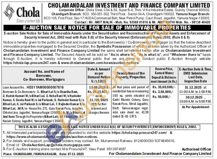 All that piece and parcel of residential house measuring 165 sq. yards situated at Garhi Mundo Colony, Guru Nanak Pura, Tehsil Jagadhri, Distt. Yamunanagar regd. vide sale deed no. 4139 dated 31-01-1973.