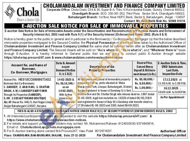All that piece and parcel of immovable property measuring 158 sq. yards situated at WakaMouja Indra Park, Linepar, Bahadurgarh, DistrictJhajjarregistered in favour of Sandeep S/o Smt. Krishna Devi and Sh. Chattar Singh vide release deed no. 1867 dated 31-05-2019, legal heir mutation no. 16220 of dated 08/05/2019 and registered in favour of Anju W/o Sandeep vide transfer deed no. 1739 dated 01-06-2023 and 3301 dated 08-08-2023.