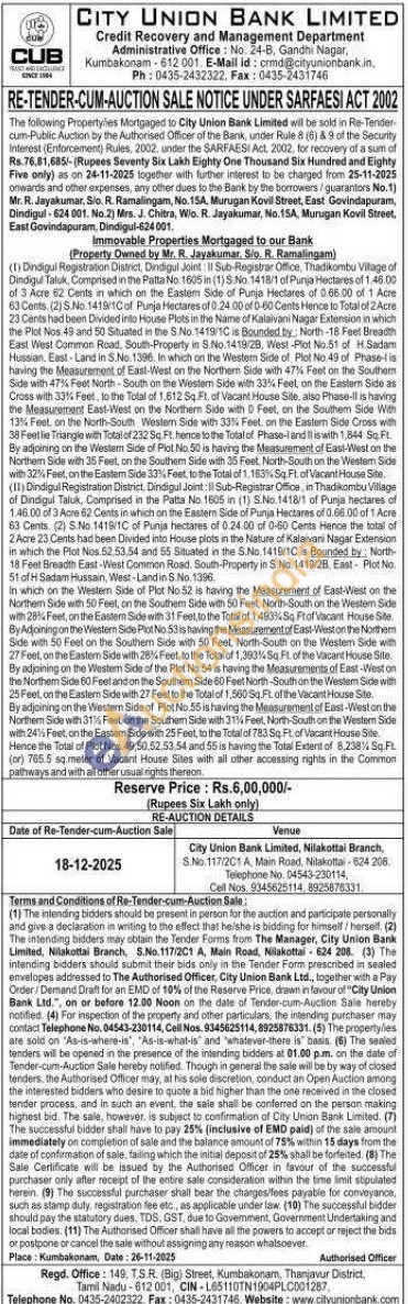 (1) Dindigul Registration District, Dindigul Joint II Sub-Registrar Office, Thadikombu Village of Dindigul Taluk, Comprised in the Patta No. 1605 in (1) S.No. 1418/1 of Punja Hectares of 1.46.00 of 3 Acre 62 Cents in which on the Eastem Side of Punja Hectares of 0.66.00 of 1 Acre 63 Cents. (2) S.No. 1419/10 of Punja Hectares of 0.24.00 of 0-60 Cents Hence to Total of 2 Acre 23 Cents had been Divided into House Plots in the Name of Kalaivani Nagar Extension in which the Plot Nos. 49 and 50 Situated in the S.No. 1419/1Cs Bounded by North-18 Feet Breadth East West Common Road, South-Property in S.No. 1419/2B, West -Plot No.51 of H.Sadam Hussian, East-Land in S.No. 1396. In which on the Westem Side of Plot No. 49 of Phase-is having the Measurement of East-West on the Northern Side with 47% Feet on the Southern Side with 47% Feet North-South on the Westem Side with 33% Feet, on the Eastern Side as Cross with 33% Feet, to the Total of 1,812 Sq Ft. of Vacant House Site, also Phase-il is having the Measurement East-West on the Northern Side with Feet, on the Southem Side With 13% Feet, on the North-South Westem Side with 33% Feet, on the Eastem Side Cross with 38 Feetle Triangle with Total of 232 Sq. Ft. hence to the Total of Phase-land is with 1,844 Sq Ft. By adjoining on the Westem Side of Plot No.50 is having the Measurement of East-West on the Northern Side with 35 Feet, on the Southem Side with 35 Feet, North-South on the Westem Side with 32% Feet, on the Eastem Side 33% Feet, to the Total of 1,163% Sq. Ft. of Vacant House Site.(11) Dindigul Registration District, Dindigul Joint: Sub-Registrar Office, in Thadikombu Village of Dindigul Taluk, Comprised in the Patta No. 1605 in (1) S.No.1418/1 of Punja hectares of 1.46.00 of 3 Acre f2 Cents in which on the Eastern Side of Punja Hectares of 0.66.00 of 1 Acre 63 Cents. (2) S.No. 1419/1C of Punja hectares of 0.24.00 of 0-60 Cents Hence the total of 2 Acre 23 Cents had been Divided into House plots in the Nature of Kalaivani Nagar Extension in which the Plot Nos 52.53.54 and 55 Situated in the S.No. 1419/TC Bounded by North 18 Feet Breadth East-West Common Road, South-Property in S.No. 1419/28 East- Plot No. 51 of H Sadam Hussain, West-Land in S.No. 1396In which on the Westem Side of Plot No.52 is having the Measurement of East-West on the Northem Side with 50 Feet, on the Southem Side with 50 Feet, North-South on the Westem Side with 28% Feet, on the Eastern Side with 31 Feet to the Total of 1,483 Sq Ftof vacant House Site. By Adjoining on the Western Side Plot No 53 is having the Measurement of East-West on the Northem Side with 50 Feet on the Southern Side with 50 Feet, North-South on the Westem Side with 27 Feet on the Eastern Side with 28% Feet to the Total of 1,383% Sq. Ft. of the Vacant House Site By adjoining on the Western Side of the Plot No 54 is having the Measurements of East-West on the Northem Side 60 Feet and on the Southern Side 60 Feet North-South on the Westem Side with 25 Feet, on the Eastern Side with 27 Feet to the Total of 1,560 Sq.Ft of the Vacant House Ste By adjoining on the Western Side of Plot No.55 is having the Measurement of East-West on the Northem Side with 31% Feet on the Southem Side with 31% Feet North-South on the Western Side with 24% Feet, on the Eastern Side with 25 Feet, to the Total of 783 Sq Ft. of Vacant House Sile Hence the Total of Plot Nos. 49,50,52,53,54 and 55 is having the Total Extent of 8,238% Sq. Ft. (or) 765.5 sq meter of Vacant House Sites with all other accessing rights in the Common pathways and with all other usual rights thereon