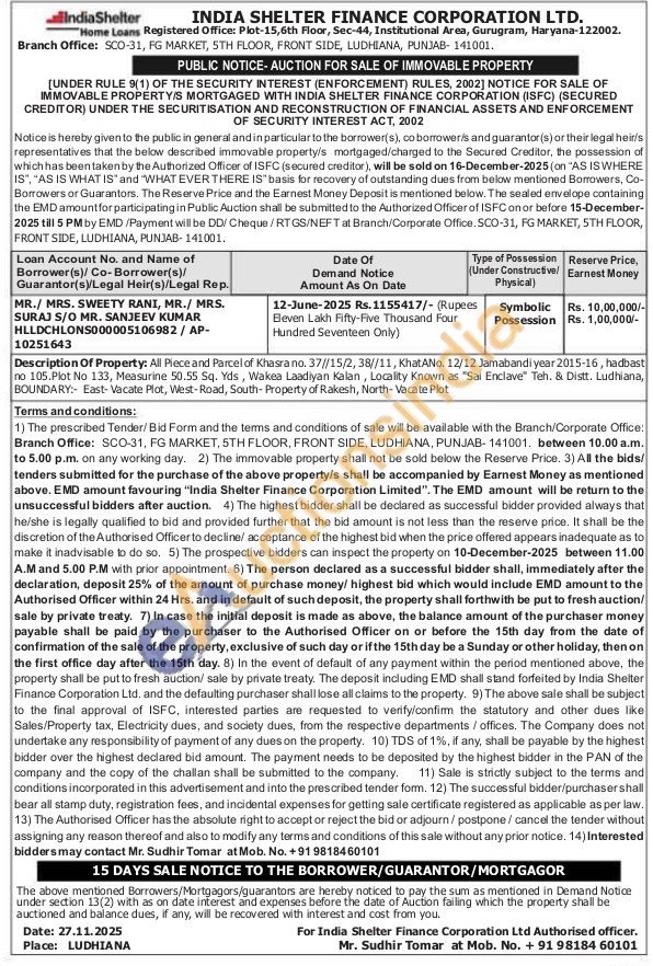 Description Of Property: All Piece and Parcel of Khasra no. 37//15/2, 38//11, KhatANo. 12/12 Jamabandi year 2015-16, hadbast no 105. Plot No 133, Measurine 50.55 Sq. Yds, Wakea Laadiyan Kalan, Locality Known as "Sai Enclave" Teh. & Distt. Ludhiana, BOUNDARY: East-Vacate Plot, West-Road, South-Property of Rakesh, North- Vacate Plot