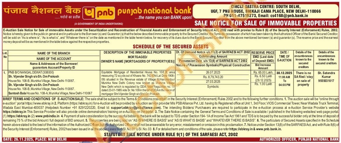 Equitable Mortgage of Residential House No. 108 B. area measuring 72 sq yds out of Khasra No. 742 (Old Lal Dora 1908-09) situated in the Revenue estate of Village Mohammadpur Munirka New Delhi Colony Color now known as Murirka Village New Delhi which is regulated by DDA, Vide Regulation no. 19 dated 23-01-1985 vide St. No 109 in the list of DDA in the name of mortgagor Shri Vijender Singh alo Shri Om Prakash