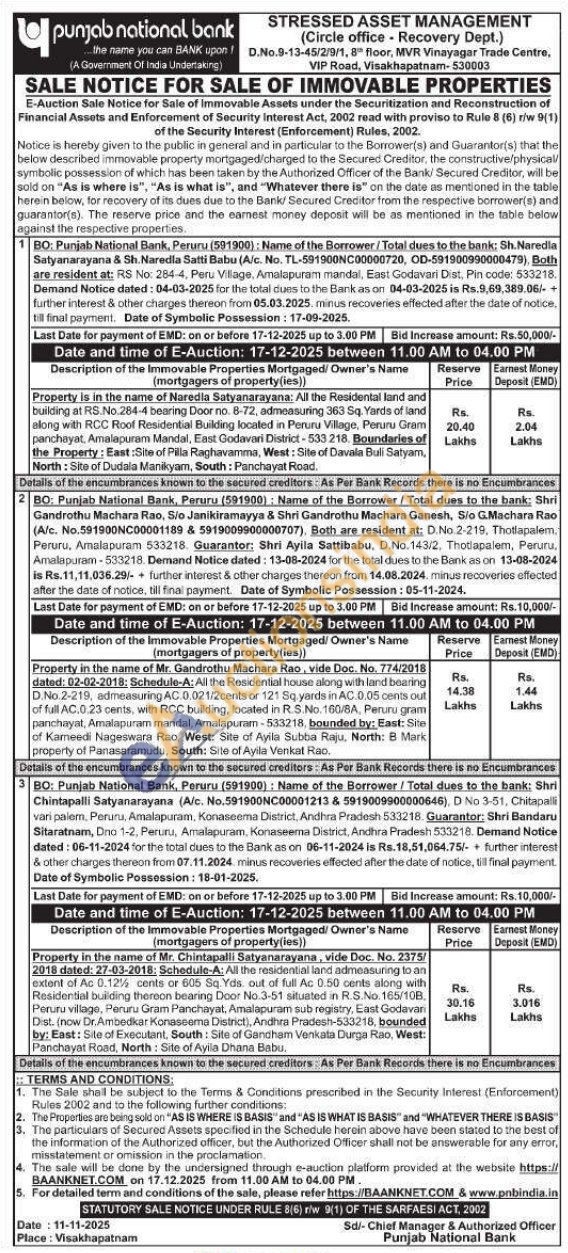 Property in the name of Mr. Chintapalli Satyanarayana, vide Doc. No. 2375/2018 dated: 27-03-2018: Schedule-A: All the residential land admeasuring to an extent of Ac 0.12% cents or 605 Sq. Yds. out of full Ac 0.50 cents along with Residential building thereon bearing Door No.3-51 situated in R.S.No. 165/108. Peruru village, Peruru Gram Panchayat, Amalapuram sub registry, East Godavari Dist. (now Dr.Ambedkar Konaseema District), Andhra Pradesh-533218, bounded by: East: Site of Executant, South: Site of Gandham Venkata Durga Rao, West: Panchayat Road, North: Site of Ayila Dhana Babu.