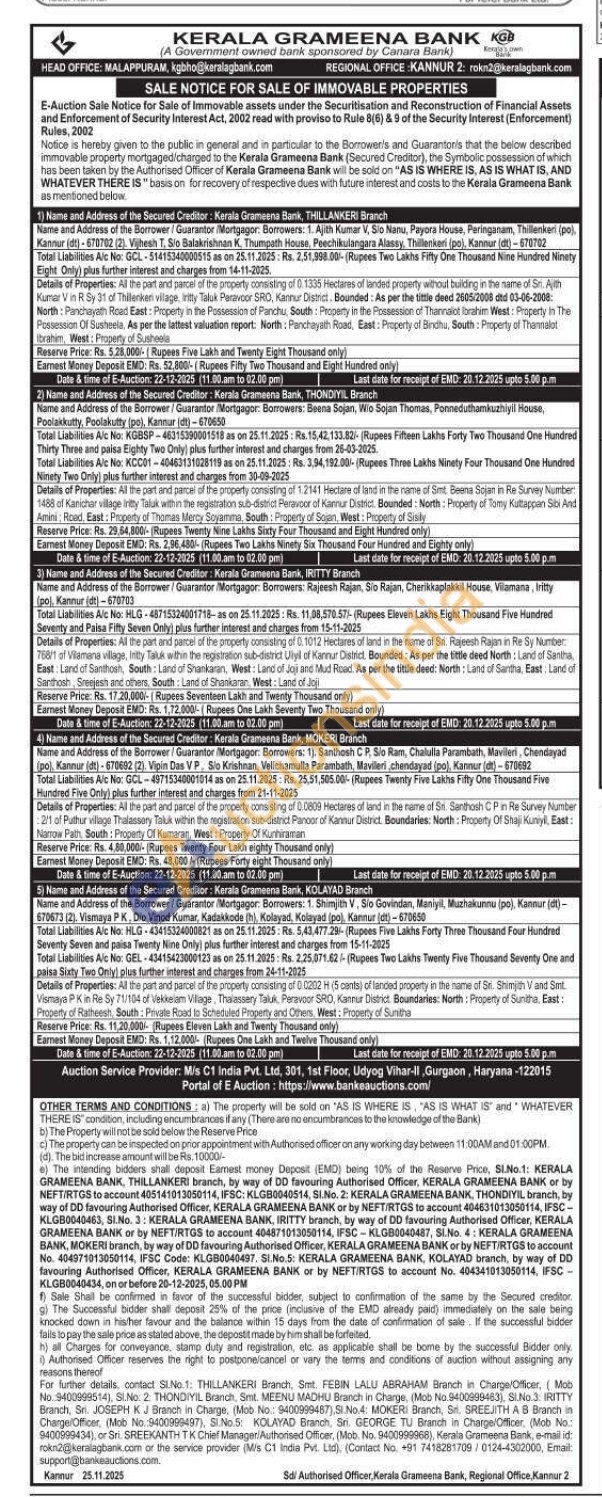 Details of Properties: All the part and parcel of the property consisting of 0.0809 Hectares of land in the name of Sri Santhosh CP in Re Survey Number 2/1 of Puthur village Thalassery Taluk within the registration sub-district Panoor of Kannur District. Boundaries: North: Property Of Shaji Kuniyil. East: Narrow Path. South: Property Of Kumaran, West: Property Of Kunhiraman