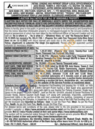 Schedule Description at Property Residential Flat Dwelling Unit beanng No-K-1608, on 16th Float in Tower-K, consisting of 3-BHK Sevant Room having a Total Super arna approximate 1810 Sq. Pt. (168.15 St. Mir) along with right to use Double Car Parlung (Covered Single bay) Space in the project "FUSION HOMES", buit on Phat No. GH-05A, situsted at Sector-Techzone V Greater Noida, District Gautam Budh Nagar, UP, along with undivided impartible, understied lease-hold rights in the portion of the and land underneath the building, consisting of several Towen comprising the Complex in proportion of the super arsa of the Said Flat Dwelling Unit, as per the enclosed plan bounded as follows: East As per the Floor Plan West As por the Floor Plan South-As per the Floor Plan, North-As per the Floor Plan