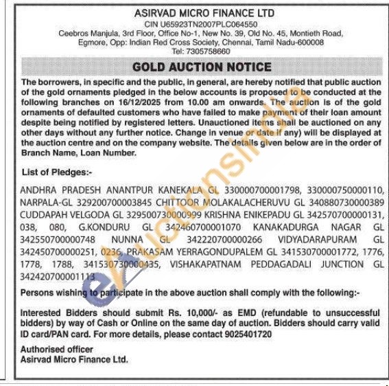 Asirvad Micro Finance Ltd Gold Auctions Auction in Anantapur