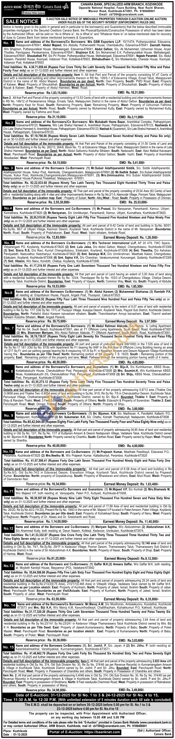 Details and full description of the immovable property: Item 1: All that Part and Parcel of the property consisting 97.47 Cents of land with a residential building and other improvements thereon in RS No. 109/5-1 of Edavanna Village, Ernad Taluk, Malappuram District in the name of Mr. Abdul Majeed. Boundaries as per deed: North: Own Property, South: PWD Road; East: Property of Kabeer, West: Property of Shoukathali. Boundaries as per Actual: North: Property of Shoukathali, South: Property of Abdul Razak & Kabeer, East: Property of Abdul Hameed, West: Road.