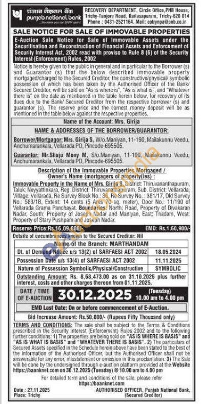 S. District: Thiruvananthapuram, Taluk: Neyyattinkara, Reg. District: Thiruvanathapuram, Sub. District: Vellarada, Village: Vellarada, Re Survey Block No.: 36, Re Survey No.: 381/17, Old Survey No.: 583/1B, Extent: 14 cents (5 Ares 70 sq. meter), Door No.: 11/190 of Vellarada Grama Panchayat. Boundaries: North: Road, Property of Divakaran Nadar, South Property of Joseph Nadar and Maniyan, East: Thadam, West: Property of Stary Pushpam and Joseph Nadar