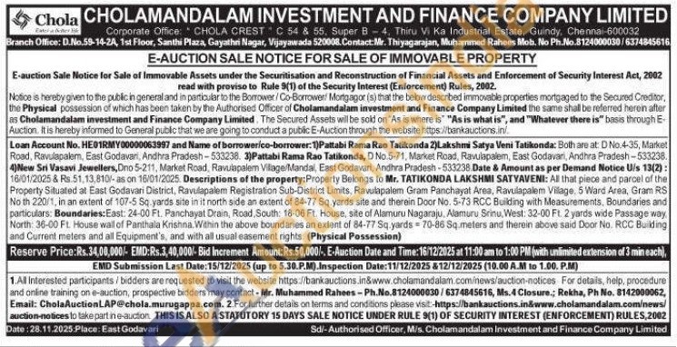 Descriptions of the property: Property Belongs to Mr. TATIKONDA LAKSHMI SATYAVENI: All that piece and parcel of the Property Situated at East Godavari District, Ravulapalem Registration Sub-District Limits, Ravulapalem Gram Panchayat Area, Ravulapalem Village, 5 Ward Area, Gram RS No th 220/1, in an extent of 107-5 Sq yards site in it north side an extent of 84-77 Sq yards site and therein Door No. 5-73 RCC Building with Measurements, Boundaries and particulars: Boundaries: East: 24-00 Ft. Panchayat Drain, Road, South: 18-06 Ft. House, site of Alarmuru Nagaraju, Alamuru Srinu, West: 32-00 Ft. 2 yards wide Passage way, North: 36-00 Ft. House wall of Panthala Krishna. Within the above boundaries an extent of 84-77 Sq.yards 70-86 Sq.meters and therein above said Door No. RCC Building and Current meters and all Equipment's, and with all usual easement rights. (Physical Possession