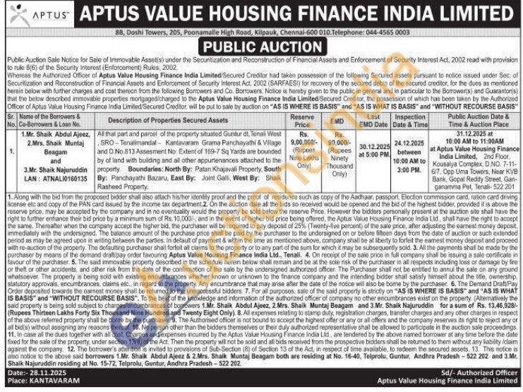 All that part and parcel of the property situated Guntur dt, Tenali West SRO-Tenalimandal Kantavaram Grama Panchayathi & Village and D.No.813 Assesment No. Extent of 169-7 Sq Yards are bounded by of land with building and all other appurtenances attached to the property Boundaries: North By: Patan Khajavali Property, South By: Panchayathi Bazaru, East By: Joint Galll, West By: Shak Rasheed Property