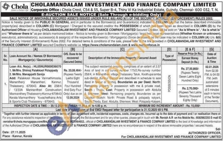 The subject residential property comprises of an extent of 3.57 Ares of land in oid survey number 175/2, Re-survey number 258/4, in Manantheri village, Thalassery Taluk, Koothuparamba sub-district, Kannur District and described in schedule to sale deed in favour of Shimoj. Boundaries as per Deed: North: Remaining property in possession with me & private road, South Thodu, East: Property in possession with Abdula & Shemeer, West: Remaining property. Boundaries as per Location Sketch North Private Road & polapady kalyani, South: Thodu, East: Abdulla, Shemeer. West: Polapady Kalyani