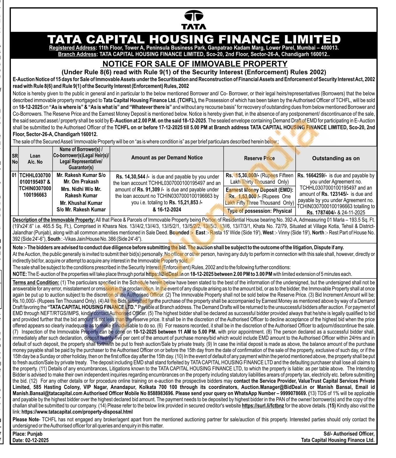 Description of the Immovable Property: All that Piece & Parcels of Immovable Property being Portion of Residential House bearing No. 392-A, Admeasuring 01 Marla-193.5 Sq. Ft. (19'x24'.6" i.e. 465.5 Sq. Ft.), Comprised in Khasra Nos. 13//4/2,13//4/3, 13//5/2/1, 13/15/2/2, 13//5/3, 13//6, 13//7/3/1, Khata No. 72/79, Situated at Village Kotla, Tehsil & District-Jalandhar (Punjab), along with all common amenities mentioned in Sale Deed. Bounded: East:-Rasta 15' Wide (Side 19'), West:-Vinny (Side 19'), North - Rest Part of House No. 392 (Side 24'-6"), South: -Vikas Jain/House No. 386 (Side 24'-6").