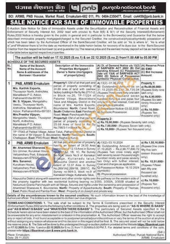 Property1: EM of all that part and parcel of property consisting of 24.89 ares of land with cashew factory building in Re Sy No. 271/1-2 in Block no.20, TP-11224 of Palamel Village, Mavelikkara Taluk and Alleppey District in the name of Mis. Karthik Exports, Boundanes: North: Canal Road. South: Chellamma East: Panchayath