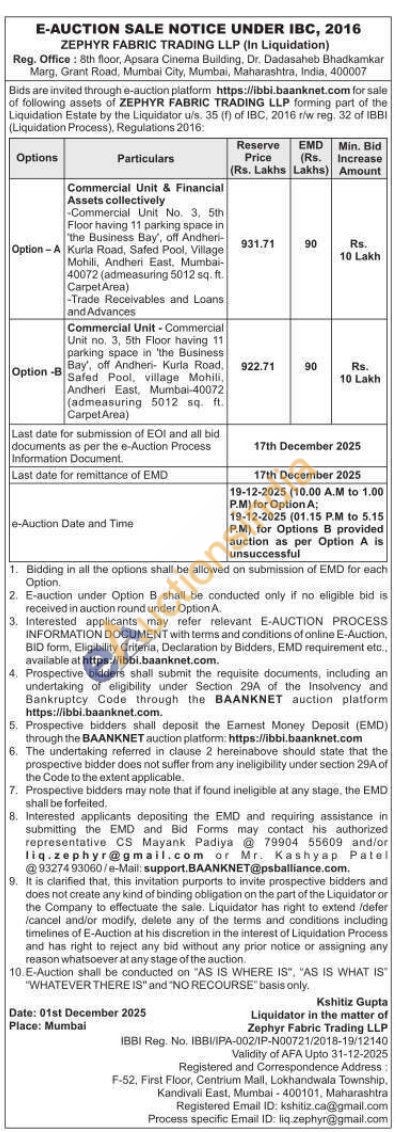 Commercial Unit & Financial Assets collectively Option-A -Commercial Unit No. 3. 5th Floor having 11 parking space in "the Business Bay, off Andheri-Kurla Road, Safed Pool, Village Mohili, Andheri East, Mumbai-40072 (admeasuring 5012 sq. ft. Carpet Area)