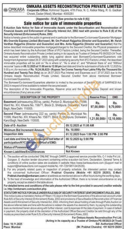 1) Basement (admeasuring 250 sq. yards), Portion D, Municipal No. 11099. Ward No. XIV, Khasra No. 158/71, Block D, Shidipura, Doriwalan, Karol Bagh, New Delhi 110005.